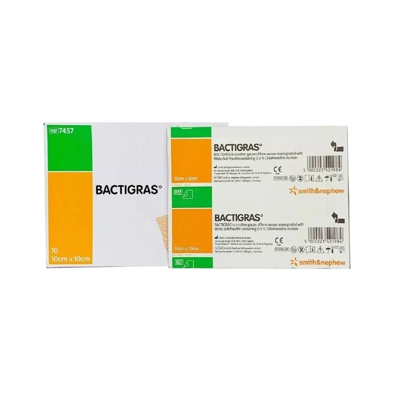 Bactigras es un apósito de gasa parafina con acetato de clorhexidina al 0.5% que actúa como agente antimicrobiano efectivo contra bacterias gram negativo, gram positivo, SARM, etc.